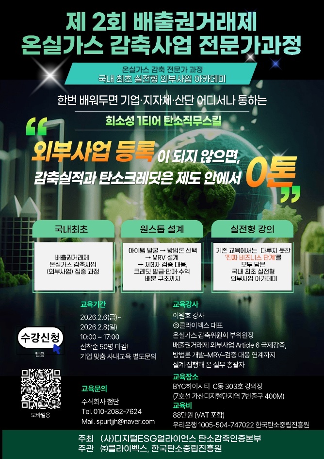 교육 과정에 참여하는 수강생은 탄소 감축 아이템 발굴부터 방법론 선택, 투자 추가성 검토, 감축량 산정, MRV(측정·보고·검증) 구조 설계, 크레딧 발급과 판매 구조까지 외부사업 전 과정을 단계별로 실습하게 된다.