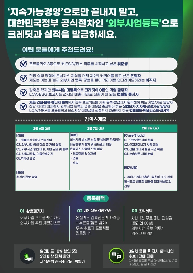 교육 대상은 취업을 준비하는 ESG·탄소 직무 지원자부터, 외부 사업 경험을 쌓아 커리어를 확장하려는 실무자, 이미 탄소 감축 투자를 했지만 크레딧을 발급받지 못한 기업 담당자, LCA와 ESG 보고서를 작성하지만 실질적인 매출과 연결되지 않는 컨설턴트, 지자체와 공공기관의 탄소사업 담당자 등이다.