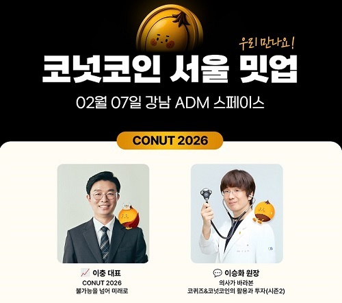 코넛코인(ConutCoin)을 발행하는 ㈜대체불가능회사가 오는 2월 7일 서울에서 밋업 행사를 열고 2026년을 향한 생태계 확장 전략을 공개한다. ‘CONUT 2026, 불가능을 넘어 미래로’를 주제로 열리는 이번 행사는 지난해 경주·광주 지역 밋업에 이어 마련된 자리로, 코넛코인과 앱테크 플랫폼 ‘코퀴즈(COQUIZ)’의 향후 방향성을 공유하는 데 초점이 맞춰졌다.