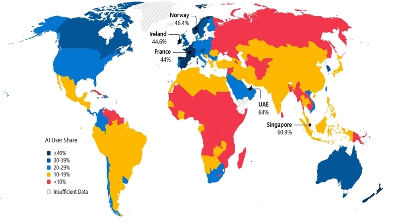 국가별 순위에서는 아랍에미리트(64.0%), 싱가포르(60.9%), 노르웨이(46.4%), 스페인(41.8%) 등이 상위권을 유지했다. 이들 국가는 비교적 소규모 국가이지만 디지털 인프라에 대한 조기 투자와 정책적 지원을 통해 높은 도입률을 기록했다. 미국은 절대적인 사용량에서는 세계 최고 수준을 유지했으나 인구 대비 사용 비율에서는 24위에 머물렀다.