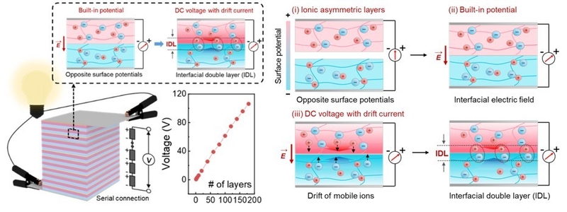 연구팀은 이러한 구조를 모방해 자극 없이도 전기를 생성할 수 있는 0.2밀리미터 두께의 전기셀을 구현했다. 이 전기셀은 양전하(+) 고분자 박막과 음전하(-) 고분자 박막이 맞닿은 이종 접합 이중층 구조로, 두 박막층이 만나 형성된 전기장이 각 박막 내부의 양이온과 음이온을 계면에 집중시키는 원리를 활용한다. 이온들이 경계면에서 대치하며 생체 세포막의 막전위와 유사한 전압이 발생한다. 막전위는 세포막 안팎에서 양이온과 음이온이 대치하며 형성되는 전기적 위치에너지 차이다.