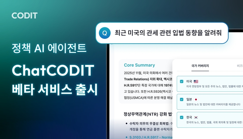코딧은 글로벌 AI 정책 에이전트 ‘챗코딧(Chat CODIT)’ 베타서비스를 출시했다고 밝혔다.
