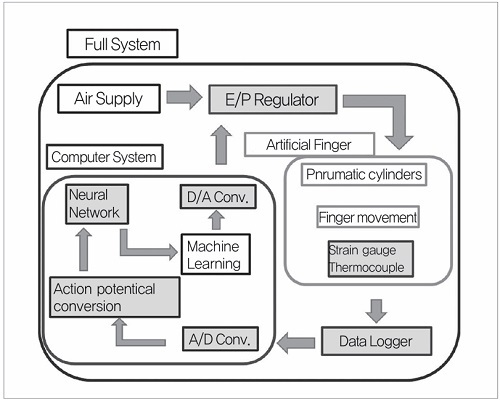 컴퓨터 시스템은 전기공압 레귤레이터에 의한 공기압 실린더의 압력 제어와 기계학습 처리를 수행하고 있다. 두 가지는 원칙적으로 서로 독립되어 실행되는데, Datalogger에서 파형 데이터 취득은 양쪽 모두 이루어지고 있다. 실린더 제어는 능동적인 촉지각 동작을 수행하기 위해 필요하며, 재질 인식은 계측 중인 모든 데이터가 필요하게 된다. 취득 데이터는 재질 인식을 우선하고 실린더의 압력 제어를 수행한다. 사람이 물체 표면을 문지를 때, 물체 표면에서 손가락이 스틱-슬립 현상을 일으키는 것이 질감의 일부를 구성한다고 생각된다. 따라서 압축성을 가지며 저강성인 공기압 액추에이터를 이용함으로써 사람이 물체 표면을 문지르는 동작에 보다 가까운 상태를 실현하는 로봇용 인공 손가락을 개발했다. 이 시스템의 인공 손가락을 그림 2에 나타냈다.