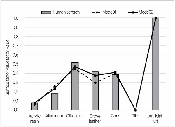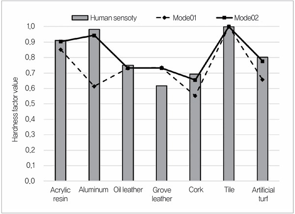 Mode01은 누르는 압력 일정 프로그램, Mode02는 기계학습 시스템을 탑재한 시스템에 의한 실험 결과로 한다. 3회의 계측 평균값을 ‘각 인자’ 측정값으로 하여 꺾은선 그래프로, 심리 평가값을 막대그래프로 하여 경도 인자의 실험 결과를 그림 3에 나타냈다. Mode01에서는 아크릴, 글러브 가죽, 코르크, 인공 잔디 등에서 심리 평가값과 괴리가 보였다. Mode02에서는 글러브 가죽에서는 괴리가 보였으나, 다른 소재에서는 개선되어 심리 평가값과 가까운 값을 나타내고 있다. 소재에 대한 적절한 누르는 압력을 학습함으로써 인식이 어려운 소재의 인식이 가능해졌다.