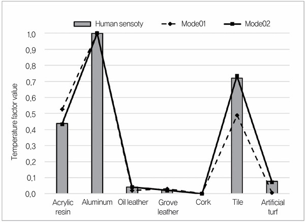 경도 인자는 물건이 단단하다고 느낄수록 수치를 높게 한다. 기준 시료는 가장 부드럽다고 느끼는 것으로 인공 잔디를 이용했다. 표면 상태 인자는 시료 표면의 요철이 심할수록 값이 높아진다. 기준 시료는 가장 표면 거칠기가 작은 타일을 선정했다. 온도 인자는 시료에 접촉했을 때에 차갑다고 느낄수록 값을 높게 하기 위해 전열성이 낮은 인공 잔디를 기준 시료로 했다. 심리 평정 결과로부터 ‘경도 인자’, ‘표면 상태 인자’, ‘온도 인자’의 세 가지 인자에 대해 개인차는 있으나, 그 경향은 대체로 일치했다. ‘경도 인자’에서는 피험자가 단단한 시료로 타일, 부드러운 시료로 인공 잔디를 인식하고 있다는 것을 알 수 있다. 그러나 가죽 소재나 코르크 등 특징이 적은 시료의 경우는 피험자에 따라 인식의 폭이 넓었다. ‘표면 상태 인자’에서는 피험자가 거친 시료로 인공 잔디, 매끄러운 시료로 타일을 인식했다. 기타 시료에서는 피험자에 따라 큰 차이는 보이지 않았다. ‘온도 인자’에서는 피험자가 온도 차가 큰 시료로 알루미늄, 작은 시료로 인공 잔디를 인식했다.