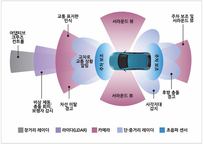 ADAS는 어댑티브 크루즈 컨트롤(Adaptive Cruise Control, ACC), 차선 유지 보조(Lane Keeping Assistance, LKA), 자동 비상 제동(Automatic Emergency Braking, AEB) 등 다양한 주행 보조 기능을 제공한다. 이를 위해 레이더, 라이다(LiDAR), 카메라 등 여러 센서에 의존한다. ADAS 시스템의 주요 구성 요소는 그림 1과 같다.