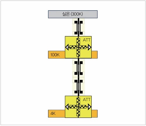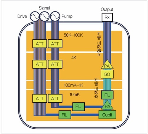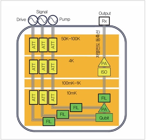 양자 컴퓨터는 앞에서 언급한 바와 같이 저온 환경에서 미약한 포톤 신호를 검출해야 하기 때문에 다양한 마이크로파 회로를 이용해 신호 검출을 하고 있다. 양자 컴퓨터 동작에 기반한 신호 구성 개략도를 그림 1에 나타냈다. 양자 컴퓨터의 심장부인 Qubit은 10mK 스테이지에 배치되며, 실온 환경에 있는 두 개의 신호원으로부터 제어용 Drive 신호와 읽기용 Signal 신호를 입력받아 동작한다. 도중에 들어가 있는 감쇠기(ATT)는 실온의 열 잡음을 저감하기 위한 것으로, 각 온도 스테이지의 열 잡음량에 맞춰 감쇠시키기 위해 분산 배치되어 있다. Qubit에서 나온 출력을 Signal 신호의 2배 주파수인 Pump 신호와 함께 넣은 진행파 파라메트릭 증폭기(TWPA)로 증폭하고, 대역 외의 신호를 감쇠시키는 필터, 이어서 반도체 증폭기의 신호 반사를 저감하는 ATT, 화합물 반도체 소자인 HEMT 등을 이용한 반도체 증폭기를 통과한 신호를 실온의 측정장치에서 수신하여 신호 처리를 한다.