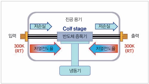 양자 컴퓨터의 입출력을 구성하는 동축 케이블을 플렉시블 기판을 이용한 고밀도 배선으로 대체한 경우의 구성 예를 그림 2에 나타냈다. Qubit에서 나온 출력을 거의 감쇠 없이 반도체 증폭기에 접속하기 위한 초전도 배선을 이용해 각 고주파 부품을 접속하고, 다른 부품 간은 플렉시블 기판을 이용한 고밀도의 저열전도 배선을 이용해 접속한다. 기존의 저열전도 특성을 가진 동축 케이블은 통과 손실이 크기 때문에 4K 스테이지에 배치된 반도체 증폭기의 이득 특성은 동축 케이블의 손실과 열 잡음의 벽을 넘는 특성이 필요해진다. 따라서 반도체 증폭기의 이득을 크게 확보하기 위해 3단 증폭 소자를 이용한 증폭기가 일반적으로 이용되고 있다.