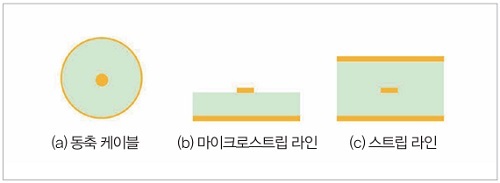 먼저 고주파 신호를 통과시키기 위한 일반적인 배선 기술을 그림 4에 나타냈다. 가장 잘 알려진 기술은 (a) 동축 케이블이다. 중심의 도체와 이를 둘러싸도록 유전체와 그라운드 도체가 배치되어 있다. 일반적으로는 구리로 둘러싸인 세미리지드(semi-rigid) 타입이 특성의 안정성 때문에 많이 이용되지만, 그라운드 측의 도체에 구리 테이프나 구리 망선을 이용하는 플렉시블 타입도 자주 사용된다. 다음의 (b) 마이크로스트립 라인은 동축 케이블을 펼친 형태로 상부의 신호 도체와 하부의 그라운드 도체가 유전체 기판의 양쪽에 배치된다. 기판을 이용한 배선으로 자주 사용되는 배선 기술이며, 유전체 기판의 두께로 배선 폭을 조정하는 것이 가능하다. 마지막으로 (c) 스트립 라인은 마이크로스트립 라인의 상부로 누출되는 전자계를 효율적으로 가두기 위해 상하에 그라운드 도체를 배치시킨 배선이다. 다층 기판의 내부 배선으로 일반적으로 이용된다. 이러한 배선 기술은 그림 4를 보면 잘 알 수 있듯이 그라운드 도체의 단면적이 크게 되어 있으며, 열전도의 큰 요인이 된다.
