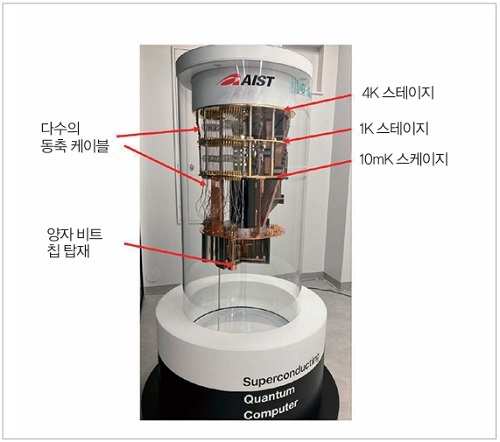 그림 1에 현재 시판되고 있는 수백 양자 비트급 양자 컴퓨터를 이미지한 그림을 나타냈다. 초전도형 양자 컴퓨터는 신호의 다중화를 하지 않는 경우, 실온에서 양자 비트가 탑재되는 10mK 스테이지까지의 사이에 양자 비트 수의 2배 이상의 동축 케이블을 실장할 필요가 있다. 따라서 1,000양자 비트를 넘는 대규모화를 실현하기 위해서는 이 동축 케이블로 인한 열 유입이 큰 장애가 되고 있다. 이는 양자 비트를 제어하기 위한 제어 신호를 양자 비트 1개에 대해 1개 이상, 마찬가지로 양자 비트에서 나오는 출력 신호를 1양자 비트에 대응해 1개 이상의 동축 케이블이 필요하기 때문이다. 이러한 구성이 불가피한 원인으로는 저온 환경에서 제어 신호의 발생이 불가능한 점, 실온과 저온 환경 사이를 고주파의 아날로그 신호 그대로 주고받고 있어 신호의 다중화가 어려운 점 등을 원인으로 들 수 있다. 이러한 문제를 해결하기 위해서는 저온 동작이 가능한 제어 회로 등 저온에서 사용할 수 있는 디바이스 개발이 필요하다. 당연히 양자 비트의 신호를 증폭하는 증폭기나 양자 비트 자체 등의 대규모는 대규모 초전도형 양자 컴퓨터 실현에는 필수이며, 1,000양자 비트를 넘는 대규모화를 위해서는 다양한 초전도 디바이스의 대규모화가 필요하다.
