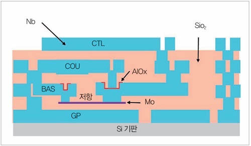 이들 장치를 사용해 Qufab에서는 초전도 양자 비트․양자 회로를 위한 새로운 공정 개발과 기업과의 산학관 연계를 진행하고 있다. 또한 PHSTP라고 하는 표준적인 디바이스 구조를 기반으로 한 회로의 시제작 대행을 하고 있다. PHSTP 구조의 단면도를 그림 5에 나타냈다. PHSTP 구조는 GP, BAS, COU, CTL의 Nb 초전도 배선 4층, Nb/Al-AlOx/Nb 조셉슨 접합층, Mo 저항층으로 이루어진 구조이다. 또한 이 구조는 설계를 쉽게 하기 위해 모든 층이 평탄화되어 있다. Nb 초전도 배선의 최소 선폭은 1.0µm이다. 조셉슨 접합의 임계 전류 밀도(Jc)는 10kA/cm2, Mo 저항의 시트 저항값은 2.4Ω이다. 이러한 공정 규칙 아래에서 사용자는 설계를 하고 Qufab이 디바이스의 시제작 대행을 하는 것이 가능하다. 이 시제작 대행은 국내외 대학, 공적 기관, 민간 기업 누구나 이용할 수 있는 제도이다.