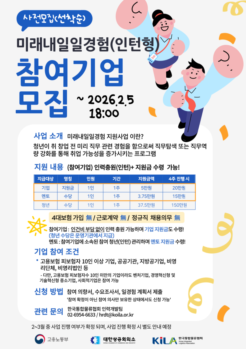 한국통합물류협회는 협회 인력개발팀을 중심으로 미래내일일경험 지원사업 운영기관 신청을 추진하고 있으며 이에 앞서 물류·유통 분야 기업을 대상으로 참여 의향 기업을 모집하고 있다고 밝혔다. 해당 사업은 청년에게 취업 전 또는 창업 이전에 직무 관련 실무 경험을 제공해 직무 탐색과 직무 역량 강화를 지원하는 정부 주도 청년 고용 프로그램이다.