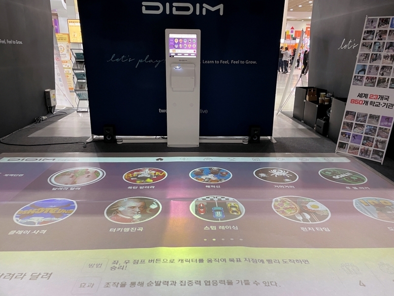 투핸즈인터랙티브는 증강현실 기반 피지컬 AI 솔루션 ‘디딤(DIDIM)’을 통해 디지털 기기 과몰입에 대한 대안적 교육 모델을 제시했다. DIDIM은 스크린 중심의 정적 학습에서 벗어나 아이가 몸을 움직이며 디지털 콘텐츠와 상호작용하는 구조로 설계된 솔루션이다. 빔프로젝터를 활용해 바닥이나 벽면에 투사된 콘텐츠에 사용자의 움직임이 실시간으로 반응하는 방식으로 신체 활동과 인지 활동을 동시에 유도한다. 실내 환경에서도 뛰고 걷고 균형을 잡는 동작이 자연스럽게 학습 활동으로 이어지도록 구성돼 디지털 기술을 활용하면서도 신체 활동을 강화하는 접근법이 특징이다.