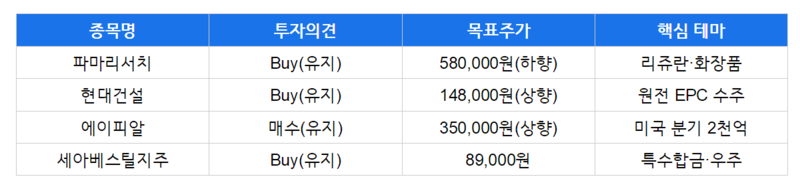 이번에 살펴본 4개 종목은 바이오(파마리서치), 건설(현대건설), K뷰티(에이피알), 특수합금(세아베스틸지주) 등 다양한 섹터의 실적 모멘텀 보유주다. 파마리서치는 리쥬란 정체에도 화장품이 역대 최대 매출로 상쇄했으며 동남아·일본 확장이 기대된다. 현대건설은 컨센서스를 12% 상회하며 원전 EPC 수주 원년을 맞이했다. 에이피알은 미국 시장에서 분기 2천억원을 돌파하며 K뷰티 디바이스의 글로벌 표준을 선점했다. 세아베스틸지주는 글로벌 특수합금 공급 부족의 직접 수혜주로 미국 자회사 SST 가동이 핵심 모멘텀이다. 증권사들은 4개 종목 모두 Buy 의견을 유지했다.
