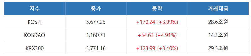 KOSPI는 전일 해외증시 강세 등 영향으로 상승 출발한 후 미국 경제지표 및 투자심리 회복 등 영향으로 전반적 강세를 시현했다. 3차 상법 개정 기대감 등 영향으로 금융 업종 중심 기관 매수세가 유입되며 3%대 상승 마감했다. 업종별로는 증권(+13.0%), 건설(+6.0%), 종이·목재(+5.1%), 운송장비·부품(+3.8%) 등이 강세를 보였다. 투자자별로는 기관(+1조6,377억원)이 순매수한 반면 외국인(-9,180억원)과 개인(-8,605억원)은 순매도했다.