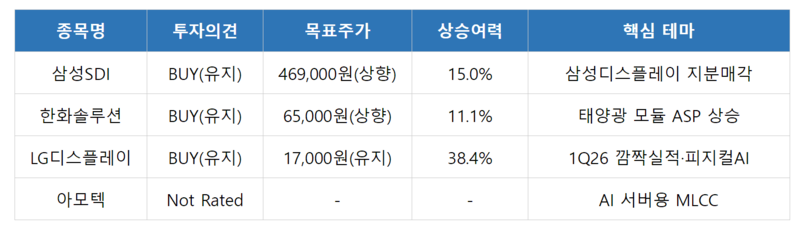 핵심 투자 근거는 삼성SDI가 '투자재원 확보 및 재무구조 개선을 위해 삼성디스플레이 지분 등의 매각 추진'을 공시했다는 점이다. 3Q25 기준 삼성SDI가 보유한 삼성디스플레이 지분(15.2%)의 장부가는 약 10.1조원이며, BOE PBR(26F 1.10배, 27F 1.04배)을 적용하면 장부가 대비 약 1.1배 수준 현금화가 가능하다. 보유 지분 전량 매각 시 최대 약 11조원 현금 유입이 기대된다.