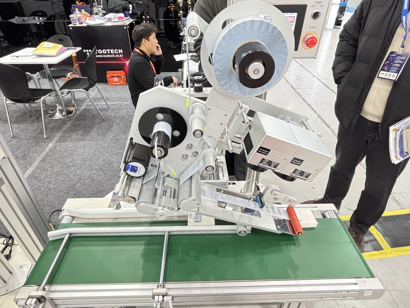이번 전시에서는 레이저 프린트 엔진을 적용한 오토 라벨러 장비가 전시됐다. 해당 장비는 레이저로 라벨을 인쇄한 뒤 자동으로 제품에 부착하는 자동 라벨링 설비로, 레이저 프린트 엔진을 통해 인쇄된 라벨은 컨베이어를 통해 이동하는 제품에 자동으로 부착되는 방식이다. 라벨 인쇄 이후 별도의 수작업 부착 과정 없이 자동으로 라벨링이 진행되는 구조다.