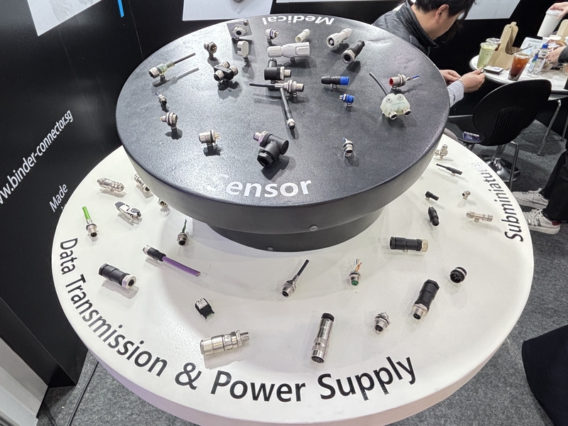 전시 부스에서는 다양한 형태의 산업용 센서 커넥터 제품이 전시됐다. 소형 커넥터부터 원형 커넥터, 케이블 연결용 커넥터 등 여러 형태의 연결 부품을 확인할 수 있다. 전시 장비에는 센서, 의료 장비, 데이터 전송 및 전원 공급 환경에서 활용되는 커넥터 제품군이 함께 소개됐다. 다양한 산업 환경에서 사용할 수 있는 연결 솔루션 구성을 확인할 수 있는 형태다.