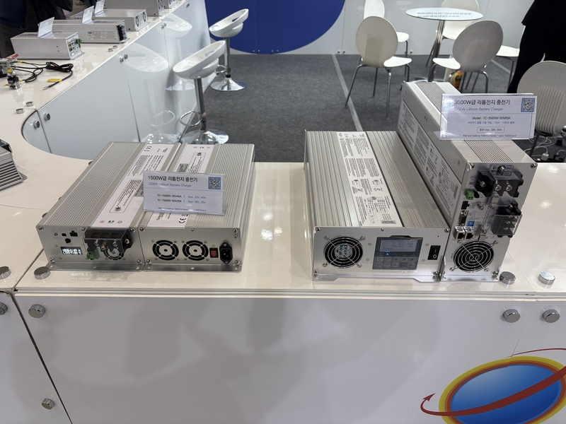 전시된 리튬전지 충전기는 300W에서 3,500W급(7,000W급 출시 예정)까지 다양한 출력 라인업을 갖추고 있다. 배터리 연결을 자동으로 감지해 충전을 시작하는 지능형 방식을 채택했으며, RS232/RS485 등 통신 옵션을 통해 상위 시스템과의 연동이 가능하다. 특히 AGV, AMR 및 산업용 전기차 등 고부하 장비의 안정적인 에너지 공급에 최적화된 성능을 제공한다.
