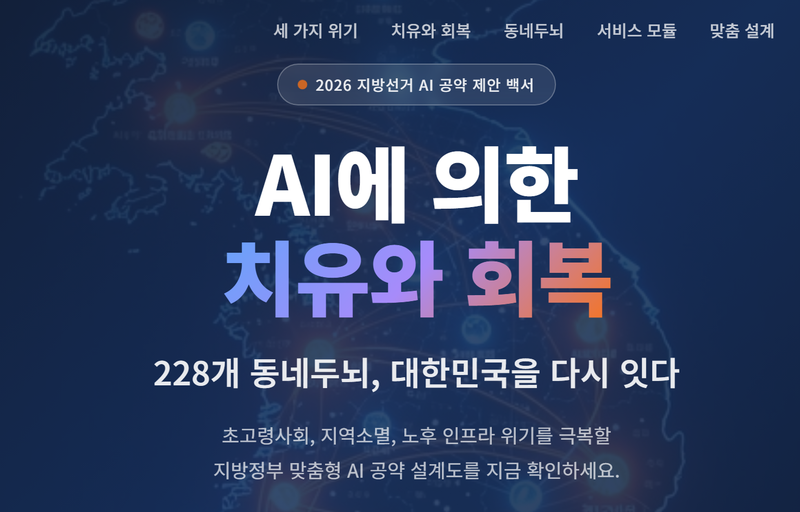 (사)한국인공지능협회(회장 김현철)가 오는 6월 3일 지방선거를 앞두고 「AI에 의한 치유와 회복, 228개 동네두뇌, 대한민국을 다시 잇다」 백서를 발간했다. 전국 228개 기초자치단체에 AI 기반 공약 설계도를 제안하는 이 백서는 민간 AI 협회가 지방선거 공약 단계부터 지자체와 회원사를 직접 연결하는 최초의 시도라는 점에서 주목받고 있다.