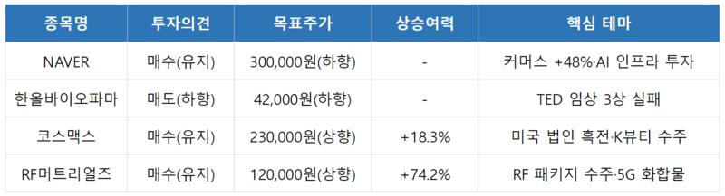 NAVER에 대해 목표주가가 기존 34만원에서 30만원으로 하향 조정되었으며, 투자의견 매수(Buy)는 유지됐다. 하향 배경은 AI 대응을 위한 인프라 투자 확대와 커머스 배송 경쟁력 강화를 위한 비용 집행으로 단기 수익성 하락이 불가피해 보이기 때문이다.