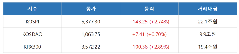 KOSPI는 호르무즈 해협 개방 기대감 등 영향으로 지정학적 긴장감이 완화되며 상승 출발했으며, 장중 전기·전자 업종 중심 기관·외국인 매수세가 유입되며 2%대 상승 마감했다. 하루 만에 상승이다. 대형주(+2.9%), 중형주(+1.7%), 소형주(+1.8%) 모두 강세를 보였다. 업종별로는 금속(+4.2%), 전기·전자(+4.1%), 건설(+4.0%), 일반서비스(+3.6%) 등이 상승을 주도했다. 투자자별로는 외국인(+8,146억원)과 기관(+7,238억원)이 동반 순매수한 반면 개인(-2조949억원)은 순매도했다.