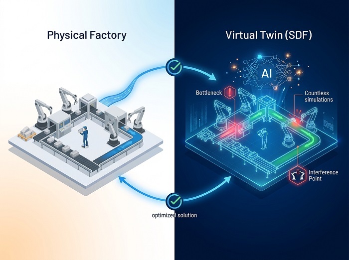 이는 현실을 디지털로 복제하는 기존 접근법을 확장한 것이다. 시공간 제약을 허물고 공장 스스로 최적의 답을 찾아가는 ‘소프트웨어 정의 공장(Software-defined Factory, 이하 SDF)’의 실질적인 구현 가능성을 제시한다는 점에서 업계의 이목을 집중시키고 있다.