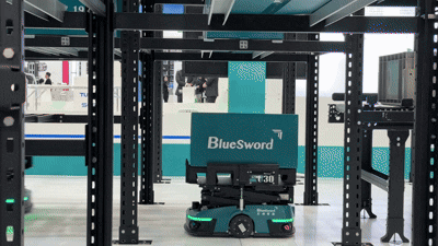 지능형 물류 로봇 제조사 블루스워드 인텔리전트 테크놀로지도 국내 시장 공략을 위해 참전했다. 이들의 주요 제품은 ‘스파이더 스카이셔틀 케이스 핸들링 로봇(Spider Sky-Shuttle Case-Handling Robot 이하 스파이더)’이다. 이는 랙 위쪽에서 케이스를 다루는 이른바 ‘오버헤드 로봇(Overhead Robot)’이다.