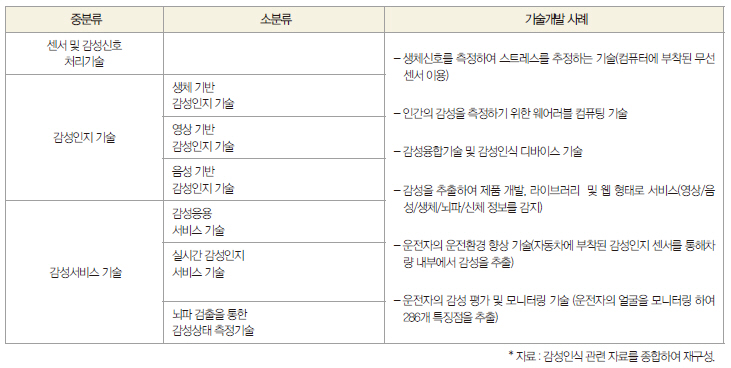 표 1. 감성인식 기술트리 및 기술개발 사례
