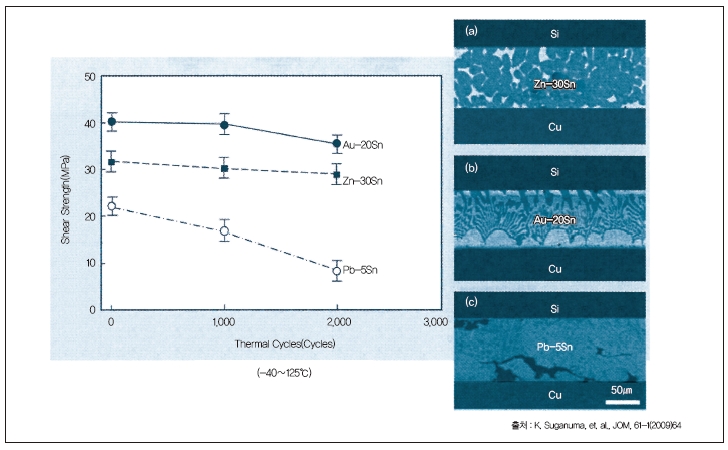 연구 결과, 벌크했을 때 Zn- 30Sn이 Bi-Ag계보다 강도 면에서 우수하다는 것이 밝혀졌다. 또한 실리콘으로 접합해 -40∼+120℃의 열 프로파일로 측정했을 때, 기존 Pb-5Sn보다는 훨씬 우수한 것을 알 수 있었다. 그럼에도 불구하고 Au-20Sn보다는 우수한 특성을 나타내지 못했다(그림 5).