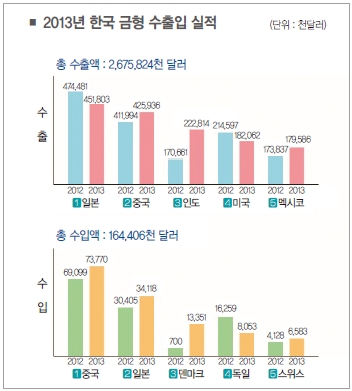 우리나라와 세계 시장에서 경쟁하고 있는 세계 5대 금형강국인 일본, 중국, 독일, 미국의 금형 수출입 실적을 조사한 결과, 지난해 우리나라 금형수출은 26억7,582만 달러로 세계 3위를 기록했다. 이는 2012년에 이어 2년 연속으로 세계 3위를 차지한 것으로, 최근의 엔저현상과 세계경제 위축 속에서도 우리나라 금형수출이 꾸준히 증가세를 이어가고 있다.