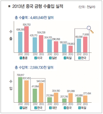지난해 중국의 금형산업은 수출 44억8,584만 달러, 수입 25억9,973만 달러로 18억8,611만 달러의 무역수지 흑자를 기록하였다. 이는 전년대비 수출 20.5%, 수입 4.8% 증가한 수치다. 중국은 주요 국가 중 가장 높은 수출 증가율을 보여, 일본을 제치고 최대 금형수출국으로 부상했다. 중국의 주요 금형수출 국가는 홍콩이 8억2,475만 달러로 가장 큰 수출 시장으로 조사되는 한편, 2012년 대비 1억 8,836만 달러가 늘어났다. 한국으로의 수출은 7,190만 달러로 전년대비 4.1%의 증가세를 보였다.
