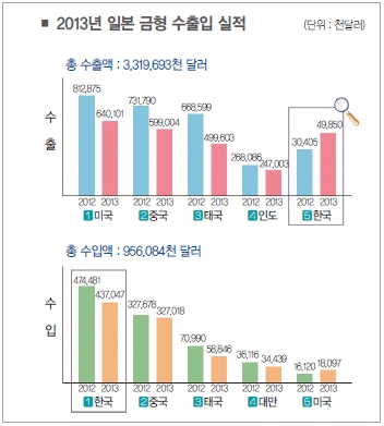 우리나라의 최대교역국인 일본의 금형산업은 수출 33억 1,969만 달러, 수입 9억5,608만 달러로 23억6,361만 달러의 무역수지 흑자를 기록했다. 일본은 미국으로 가장 많은 수출을 하고 있으며, 지난해 수출액은 6억410만 달러에 달했다. 이어서 중국, 태국, 인도네시아 순으로 조사됐다. 한국으로의 수출은 4,985만 달러로 전체 수출액의 1.5%를 차지하며, 전년대비 6.4% 증가했다. 그러나 엔저현상 등이 지속됨에 따라 일본 금형수출은 2012년 대비 14.7% 감소하는 등 일본 금형업계의 어려움이 커지고 있는 것으로 나타났다.