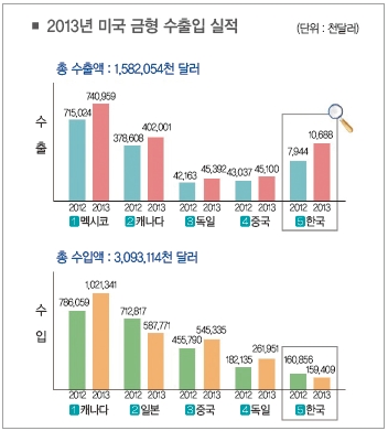 미국은 자국 내 제조업체의 해외이전 가속화, 인건비 상승 속에 자동차산업 확대로 해외 금형 수입의존도가 높아지고 있다. 미국은 세계 금형수입국 중 사상 처음으로 30억 달러를 돌파했으며, 2012년 대비 13.4% 증가하는 등 폭발적으로 증가했다. 특히 캐나다로부터 수입은 10억 달러가 넘어서는 등 새로운 기록을 쓰기도 했다. 이어 일본과 중국으로부터 각각 5억8,777만 달러, 5억4,533만 달러를 기록해 한국 금형의 전략적인 시장 진출이 요구되고 있다.