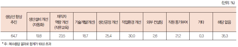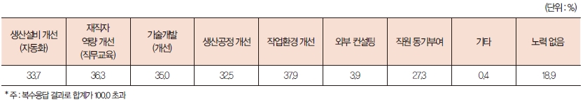 반면, 생산성 향상을 위해 노력한 부분은 작업환경 개선 30.0%, 생산공정 개선 25.4%, 재직자 역량 개선(직무교육) 23.5%, 직원 동기부여 21.2% 등의 순으로 나타났다.
