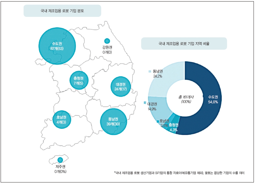 우리의 제조업용 로봇기업은 전체 161개사로 수도권에 87개사(54.0%), 동남권에 39개사(24.2%), 대경권에 24개사(14.9%), 충청권에 7개사(4.3%), 호남권에 4개사(2.5%)가 위치하는 것으로 조사됐다.