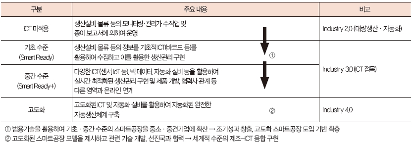 현재 산업부에서는 ‘제조업 혁신 3.0 전략’을 수립하고, ‘독일 Industry 4.0’ 수준의 고도화를 추진하기 위한 일환으로 2020년까지 1만개 스마트 공장 보급·확산할 계획으로 IT·SW, 사물인터넷 등을 활용하여 생산 전과정을 지능화·최적화하는 것을 추진 중이다.