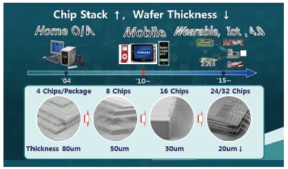 또한, 칩의 양이 많아지고 웨이퍼의 두께가 얇아지면서 머신비전의 역할도 중요해졌다. 과거에는 PC 한 대로 검사를 다 했다. 지금은 모바일로 넘어갔고, 다시 모바일에서 웨어러블과 IoT, 인더스트리 4.0까지 와 있는 상황이다. 즉, 각종 데이터들은 단순히 데이터에만 머물지 않고 정보화되어 전략적으로 사용하고 판단하는 수준까지 와 있다. 휴대폰의 경우, 소자 하나에 과거에는 칩이 4개뿐이었으나 지금은 칩이 24개 또는 32개가 들어가 있다. 칩이 24개가 들어가면 그만큼 실리콘이 얇아진다. 그 하나의 두께는 100μm의 5분의 1인 20μm 실리콘이 24장 들어가 있다고 보면 된다.