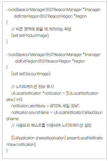 리스트7은 비콘의 위치에 따라 상품의 정보나 상태를 표시해 주는 루틴이다. 즉, 비콘의 영역 안 근처 일때는 상품에 대한 광고 정보를 보내고 비콘 근처에 갔을 때는 상품의 자세한 정보를 출력해 상품에 대한 광고를 한다.