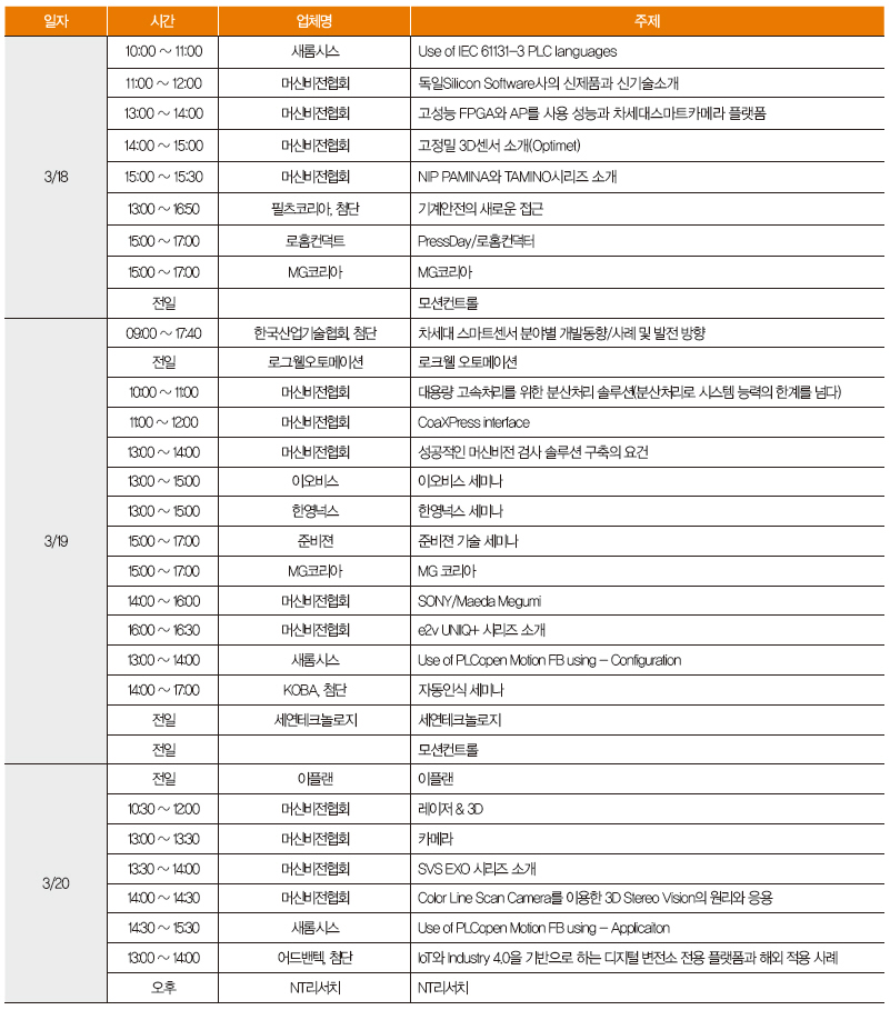 머신비전 컨퍼런스에서는 머신비전 검사 솔루션 구축 요건 및 신제품 신기술을 소개하며, 기계 안전 세미나에서는 기계 안전의 새로운 접근법 등을 집중 다룰 예정이다.