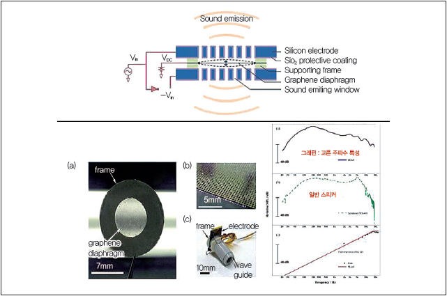 강도를 높이며 저주파 특성도 향상시키기 위해 상대적으로 큰 다이어프램(진동판)을 사용한다. 결론적으로 그래핀 소재 스피커 이어폰은 전체 오디오 주파수 범위(20Hz∼20KHz)에 걸쳐 우수한 주파수 응답이 측정되고, 오히려 기존 스피커 제품 특성을 능가한다고 볼 수 있다.