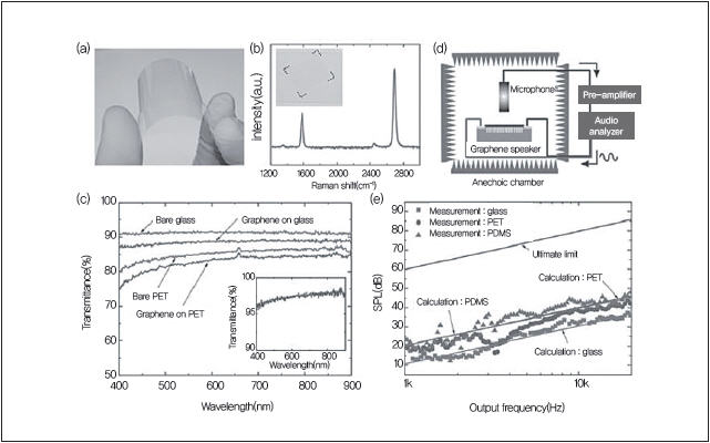 국내에서는 서울대 장정식 교수 연구팀이 그래핀을 활용한 투명 필름 스피커를 개발했다. 그래핀 전극과 PVDF(불소고분자)필름을 이용해 잘 휘어지는 투명한 스피커를 개발하는 데 성공했다.