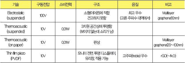 이러한 그래핀을 이용한 스피커들의 특성은 표 2와 같이 정리해 볼 수 있다.