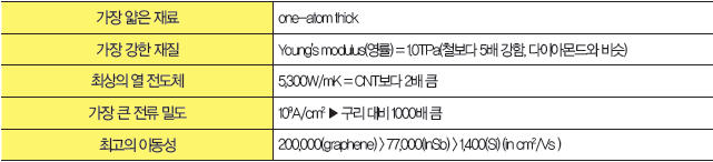 최근 미국 UC버클리의 연구팀이 세계 최초로 그래핀으로 만든 진동판을 사용한 이어폰을 만드는 데 성공했다. 그래핀 이어폰은 두께 30nm, 넓이 7mm의 그래핀 시트를 사용해 진동판을 만들고, 이 그래핀 진동판을 두 개의 실리콘 전극 사이에 넣어 음파를 생성한다. 이러한 그래핀의 우수한 기계적 성질은 표 1과 정리할 수 있다.