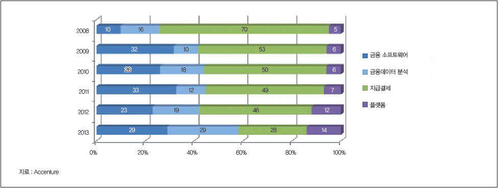 핀테크 기업에 대한 글로벌 투자 금액은 2008년 9억 3천만달러에서 2009년 9억 8천만달러, 2010년 19억 8천만달러, 2011년 24억 3천만달러, 2012년 27억달러를 거쳐 2013년 29억 7천만달러까지 꾸준히 증가해 왔다. 즉 최근 5년간 3배 이상의 성장을 보인 것이다. 사업 영역별 투자 비중을 보면 특히 금융데이터 분석과 소프트웨어 부문의 투자 비중이 증가한 것을 알 수 있다(그림 3).