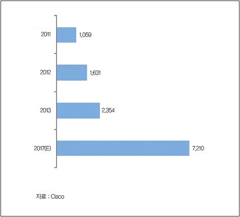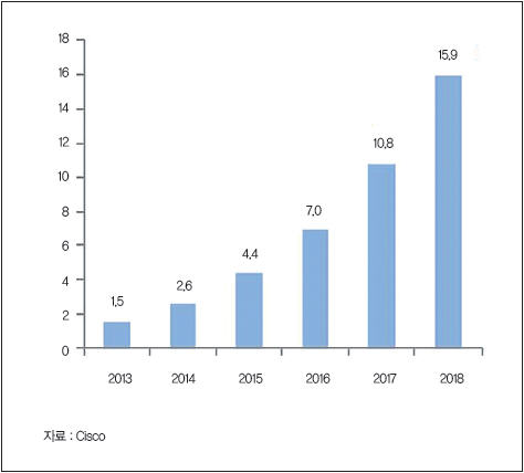 이처럼 최근 핀테크 산업이 주목받는 이유는 모바일 트래픽이 급증함과 동시에 모바일 채널을 통한 금융 거래가 늘어나 관련 산업이 발전할 수 있는 여건이 형성됐기 때문이다. 글로벌 모바일 트래픽량은 2013 1.5EB에서 2018년 15.9EB로 폭발적인 증가를 보일 전망이다(그림 4). 글로벌 모바일 결제 시장 규모 또한 2013년 2354억달러에서 2017년 7210달러로 성장을 지속할 것으로 분석된다(그림 5).