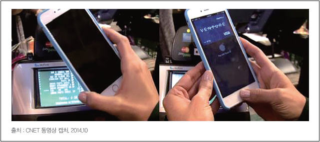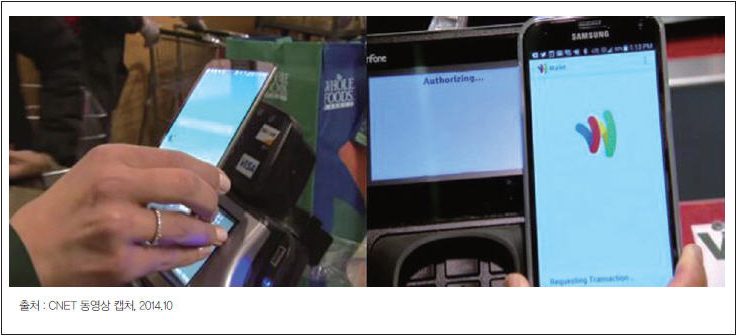 Google Wallet을 이용하기 위해서는 그림 3과 같이 일단 스마트폰의 잠금을 해제한 후 리더기에 가져다 대어야 하며, Softcard의 경우 스마트폰을 잠금 해제 한 후 앱을 실행시키고 단말기를 가져다 대어야 하는데, 두 서비스 모두 단말 잠금 해제와 본인 인증을 한 번에 처리할 수 있는 지문인식과 같은 기능이 필요하다.