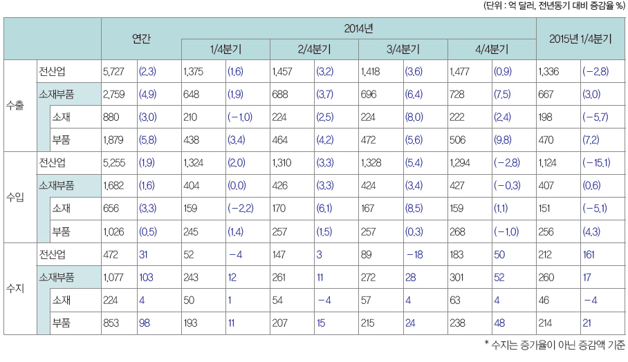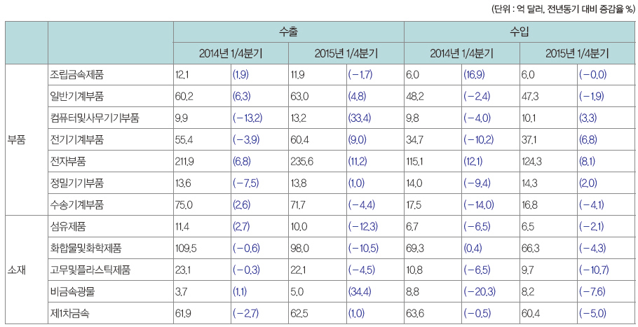 표 1. 소재 및 부품 산업 2014년 및 2015년 1/4분기 무역 동향