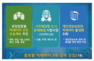 이 전략에 따르면 정부는 2019년 글로벌 빅데이터 3대 강국에 진입한다는 목표 아래 ▲유망업종별 빅데이터 선도 프로젝트 추진 ▲시민체감형 도시 문제해결 시범사업 ▲개인정보보호와 빅데이터 활용 조화 등의 전략을 추진할 계획이다.