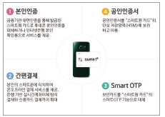 ‘스마트OTP’는 인터넷뱅킹 및 스마트폰뱅킹 이용 시 IC칩이 내장된 스마트카드를 스마트폰에 접촉하여 NFC(근거리무선통신)를 이용해 IC칩에서 생성된 일회용 비밀번호를 생성하여 인증하는 방식으로 고객의 편의성 및 안전성이 강화됐다.